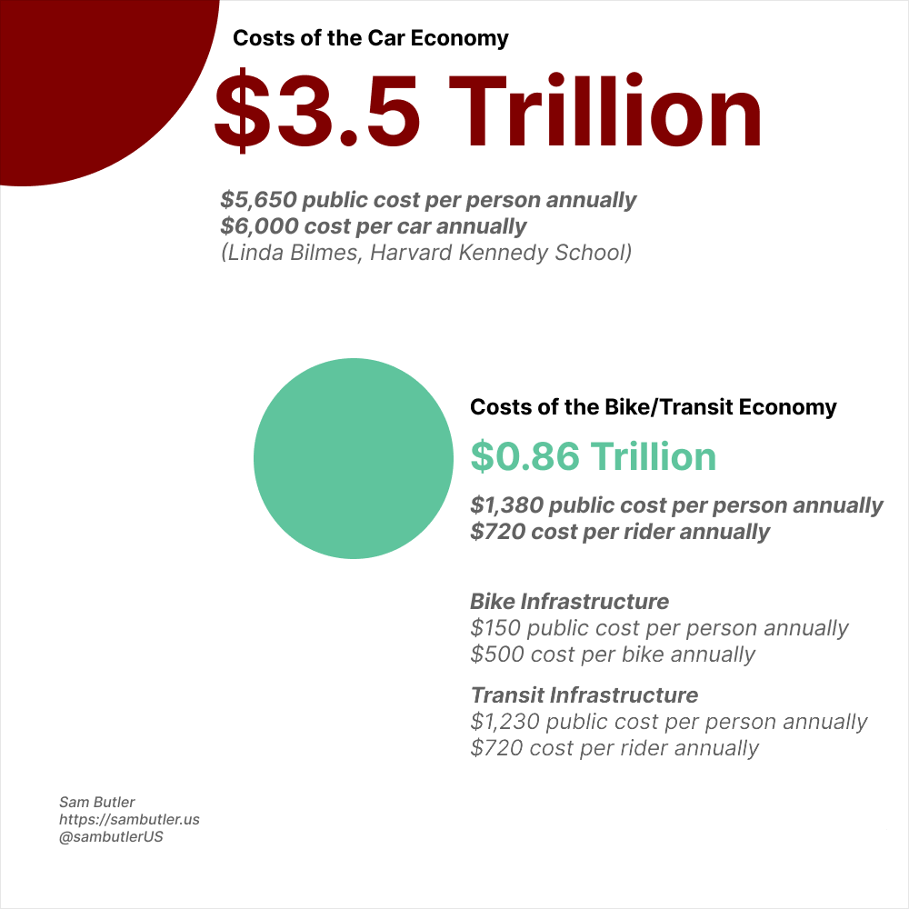 - 331.9 million people x $650 public + private bike costs = $0.215 trillion per year.